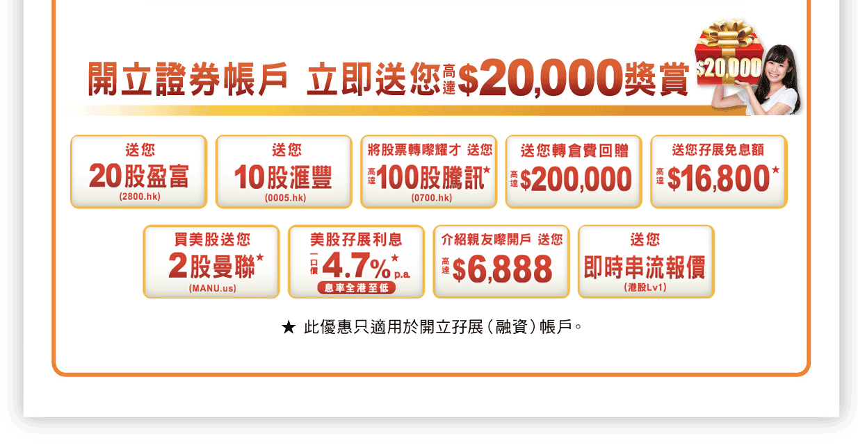 由2024年12月23日開始至2026年3月31日,凡客戶於耀才開立孖展(融資)證券帳戶,並將股票轉至耀才,即可獲以下雙重獎賞(1. 高達100股騰訊 及 2. 高達$200,000轉倉費回贈)